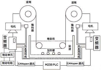 双变频卷染机包括常温常压和高温高压型卷染机,主要用来将坯布进行染色处理,处于染整工序里的前道工序,主要是利用两根卷绕轴将布匹按照一定的工艺要求包括温度,道数,速度,张力等工艺下通过染缸里染液里来回不停运行进行染色,从而达到一定的染色效果,染色的好坏、是否均匀及是否对布匹有损伤都取决于两根卷绕轴的运行情况。原理如图:
