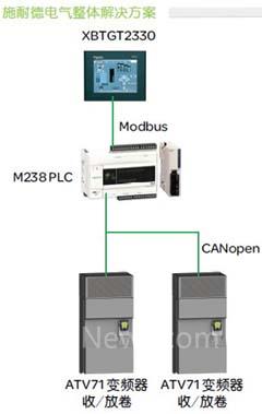 M238 PLC利用内置的CANopen总线接口来控制变频器的给定和运行命令,包括张力和速度的切换,无需再加总线控制模块节约了成本。温度和圈数均通过变频器来中转,节省了模拟量模块和高速计数器的输入点数;