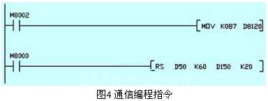 为了使变频器上位机能对PLC进行显示、报警及记录,PLC还配置了通信模块FX2N-232BD,实现与变频器上位机的串口通信,通信编程指令如图4所示。
