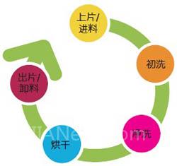 上片→预淋清洗→风干→冲洗→风干→离子水清洗→风干→烘干→出片