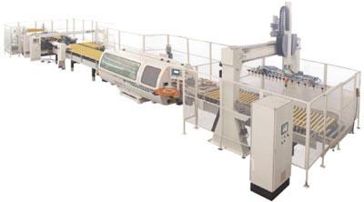 下面以双端封排钻生产线举例介绍,二工位或三工位龙门式上料系统的吸头吸规格板材到辊道上,在辊道上通过皮带把多块板材分开,均匀间隔在输送辊台上向前输送,经过双端封边机封边,排钻钻孔,再经过90度转向机转向后对另外两个边封边.钻孔,最后通过二工位或三工位龙门式下料系统的辊台将板材重新排列(最大8行2列),用吸头将排好的板材从辊台上吸下堆垛到地辊上,完成上下料加工过程.