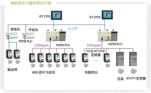 (M258 PLC,带以太网,CANopen,Modbus通信,10台ATV312,压延机主机为ATV71,走CANopen通信,挤出机为直流调速器,为模拟量控制,XBT GT2110触摸屏)。