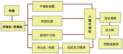 输送带—密炼机 –开炼机—600胶片冷却线—10工位导开卷取装置---供胶前输送带---挤出机供胶带---挤出机----挤出压延输送带---压延机---压延动力辊排—八辊冷却机—定长裁断装置—裁断后输送带—动力称—后输送辊排。