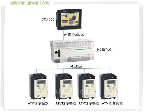 整套方案采用施耐德电气M218 PLC配合HMISTU855触摸屏以及ATV12变频器。出于成本上的考虑,变频器频率给定通过Modbus总线给定。以前配置方案采用台系PLC加模拟量模块经,成本比较高,M218带有两个串口,可同时与触摸屏和变频器进行通风,实现了更高的性价比。