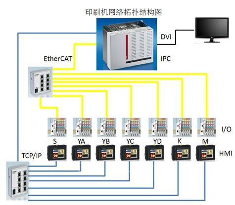 印刷机整个控制系统的网络拓扑结构如图所示。工控机(IPC)为控制的主体,利用倍福TwinCAT自动化软件编写逻辑控制程序在工控机上运行,通过EtherCAT高速以太网现场总线来收发各机组远程I/O端子模块信息,同时运行生产管理系统软件,对生产过程进行管控;各机组上安装HMI,通过TCP/IP协议与IPC建立通讯,以显示各部分的工况和调整工艺参数。