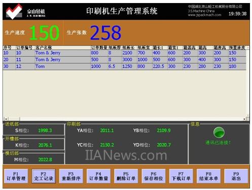利用高级语言编写上位机程序,应用在工控机上。通过BECKHOFF固有通讯方式与TwinCAT的PLC程序进行通讯,可以输入订单、发送换单指令到印刷机的各部分,各部分按照指令,进行相应的调整。同时,生产管理系统,能收集各部分的生产状态信息并保存于计算机中,以便查阅。管理系统主界面如图所示。
