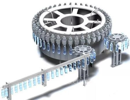 此外,也有其他灌装设备采取托盘瓶子位置固定,通过控制喷嘴的上升、下降位置、速度来控制瓶子灌装。虽然机械结构有所不同,但原理大同小异,均使用伺服电机控制位置,以保持灌装时喷嘴和瓶内液面的位置不变。