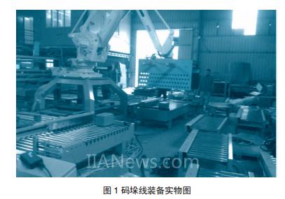 码垛线分为 A、B 两线,每条线均由以下部分组成:入口输送带 1、入口输送带 2、入口输送带 3、分离电机、转向电磁阀、转向滚筒、堆叠输送带,出口输送带等;A、 B 两线共用栈板供应系统和左右栈板输送带等设备。码垛线装备实物图片如图 1 所示。