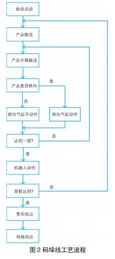 货物由入口输送带1进入,经过三个入口缓存输送带,输送到分离电机处;分离电机分离后根据需要确认是否转向 ( 如需转向则转向气缸动作 ) 并计数,PLC 进行判断产品是否已完成一列。达到一列后控制推杆动作,将货物整平。此时,PLC 发出 DO 信号给 ABB 机械手 (ABB 机械手与 PLC 通过硬接线连接 ),机械手动作抓取已完成码垛的一列产品;当完成一垛后,堆叠电机动作,将已完成堆垛的货物整垛输出;然后栈板供应启动,为缺少栈板的堆叠区提供栈板,依次循环实现持续码垛。其工艺流程如图 2 所示。
