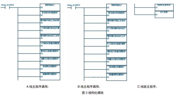 由于码垛线控制点数较多,程序较大,而且各部分功能较为分明,所以在软件设计时,采用结构化编程的理念可使程序结构更加分明。程序设计分为主程序和子程序两部分,主程序中 AB 两线运行各自调用相应子程序。子程序主要有:开机初始化程序、各设备手动控制程序、入口计数子程序、整列推杆初始化子程序、自动运行子程序、堆叠方式处理子程序、故障报警子程序、系统复位及数量清零等子程序组成,如图 3 所示。