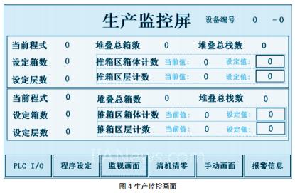 (1) 主画面:用于监视两条生产线当前运行数据,如当前程序 ( 配方 )、每层设定箱数、设定层数,已计箱区箱体数、已计当前层数等如图 4 所示。