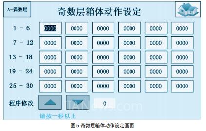 (2) 奇数层箱体动作画面:奇数层用于设定当层数达到奇数层时 ( 例 1 层、3 层、5 层等 ),该层即按本触摸所设定的方式进行堆叠,如图 5 所示。