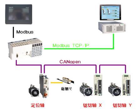 Motion:一台 LXM32M 控制定位机构,外部磁栅尺接入 LXM32M,形成全闭环控制,确保定位精度,两台 LXM23A 控制锯切机构上位机系统:采用 VB 开发的界面,具有型材优化,加工样式保存与导入等功能,与 PLC之间采用工业以太网通讯。