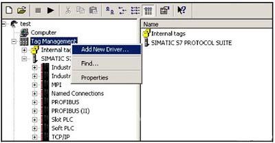 网卡安装正确后,打开WINCC,选择”Tag Management” 击右键选择”Add New driver” ,再弹出窗口中选择”SIAMTIC S7 protocol suite”连接驱动,将其添加到”Tag Management” 向下,如下图: