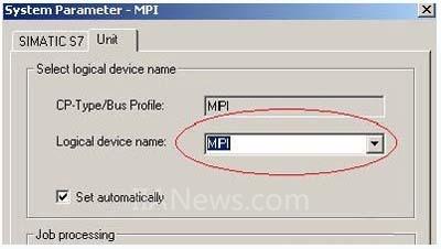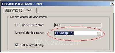 最后在WINCC 的“SIAMTIC S7 protocol suite ”协议下选择MPI,按右键选“System parameter ”,在弹出窗口中选择通讯设备名称,如下图所示: