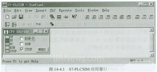 S7-PLCSIM仿真软件打开后,软件应用窗初始操作界面中有一个CPU 300/400控制面板模拟窗口(以下称“模拟面板”,见图14-4.1),它用来模拟实际PLC的CPU控制面板。