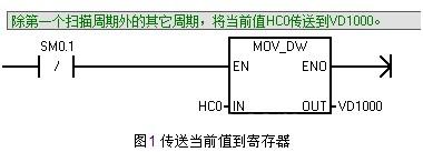 首先,在除了第一个扫描周期之外的其它周期,将高速计数器0的当前值HC0传送到寄存器VD1000中,如下图1所示,以保证寄存器VD1000始终存储的是HC0的当前值。