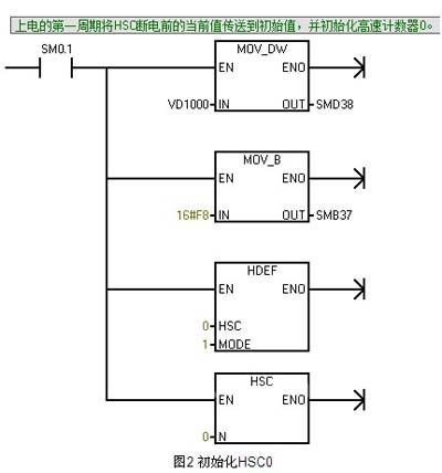 其次,在上电的第一周期将寄存器VD1000存储的数值传送到高速计数器的当前值,保证高速计数器以VD1000为初始值开始计数,并初始化高速计数器0,如下图2所示: