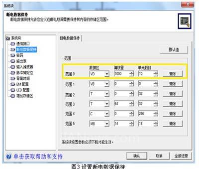 最后,在系统块的断电数据保持处设置寄存器VD1000为断电保持区域,如下图3所示。需要注意的是CPU224及其以上的型号最多支持100个小时(理论值)的断电保持时间,如果断电时间超过100个小时的话,可以考虑增加电池卡;或者将当前值保存到MB0-MB13这14个字节的存储单元。