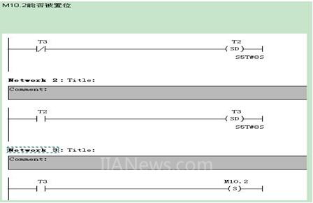 程序是顺序扫描的,从Network 1—3依次进行,以第一个周期开始时来分析,首先扫描Network 1中T3计时器为0,因此闭点使能,T2开始计时(0-8S),但此时扫描T2输出为0,因此扫描到Network 2中T2开点不使能,扫描到T3不执行,Network 3中T3开点不使能,M10.2为0。