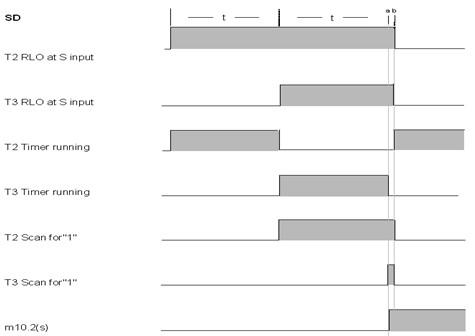 T3开始计时的前提条件是T2开点闭合,假设在第m个周期里,T3开始计时,那么同样,要经过大概m个周期左右,T3才能执行完毕,到此时,已经经过了2m个周期,因为M10.2线圈是由T3开点的闭合信号来置位的,那么现在就来分析一下什么时候可以发生此动作。