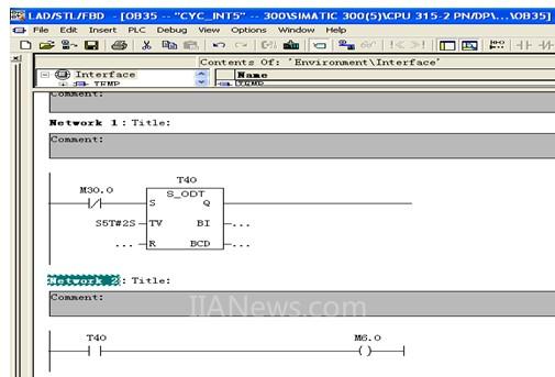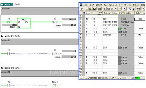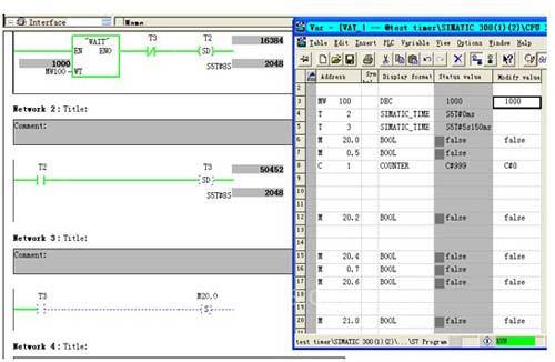 2,也可以在OB1里调用多个“wait”代码让OB1的扫描周期足够大,如5s,先调用一个SD T2 1s,然后调用若干“wait”,大概持续2s,用T2开点触发一个线圈如M10.0,再调用若干“wait”,大概1s,然后再调用一个SD T3,可以看出再T3还没有开始计数时,M10.0已经被置位了。