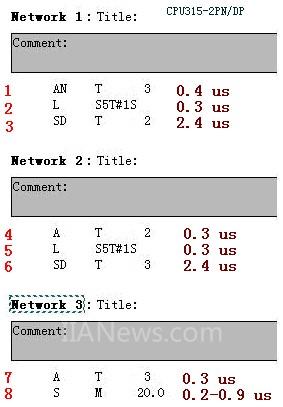 然后加上刚才的时间X us,那么一个周期可以认为是t=X+6.6 (7.7) us。X大于7 us,可以看出语句的执行是在很短的时刻进行,所以大家在编程时常用的每个计时器都会经过若干个程序扫描周期。