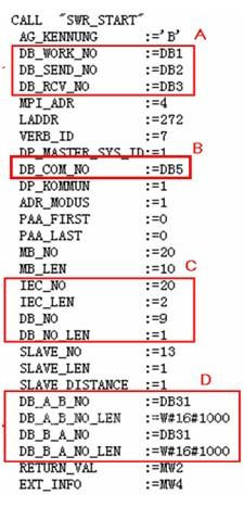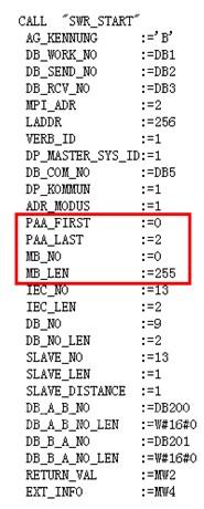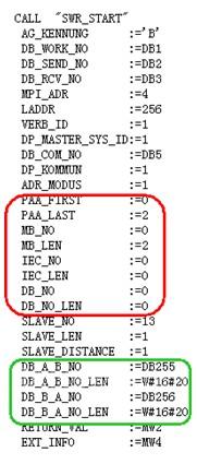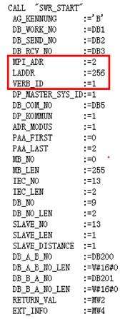 Ø 根据不同的同步方式,注意FC100 “SWR_START”的参数,如图20。“MPI_ADR”表示对方的MPI地址,对于MPI同步有效;“LADDR” “VERB_ID”对于PROFIBUS/ETHERENT 同步有效,分别代表同步CP的硬件地址和连接号,如图21。
