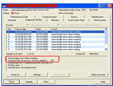 Ø 创建的长度必须是偶数字节,不能是奇数字节,如图10;A、 B站点长度一致。否则,CPU停机,诊断缓冲区如图11: