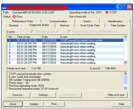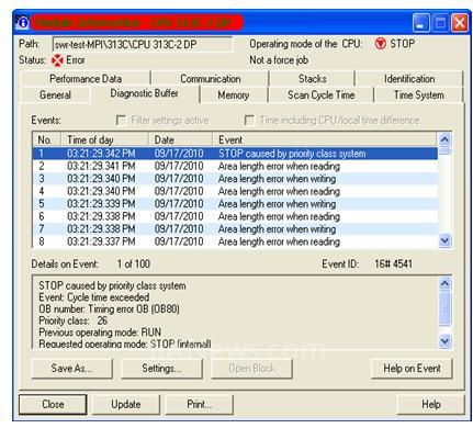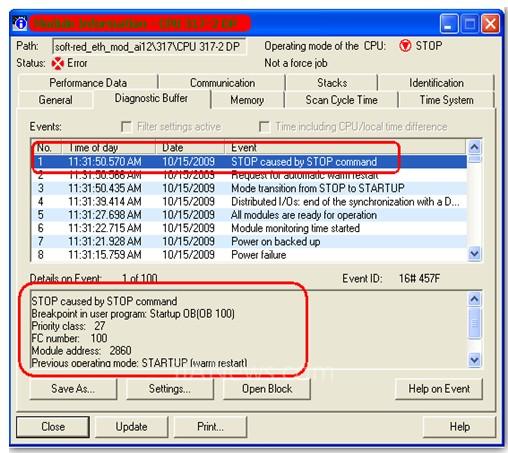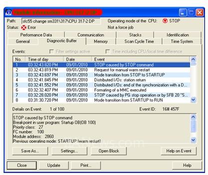 CPU暖启动过程中如果PROFIBUS总线故障,V1.2版本会导致CPU停机,诊断缓冲区如图29;V1.3版本,CPU 不会停机,SF 亮BF闪烁,诊断缓冲会报总线错误。