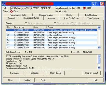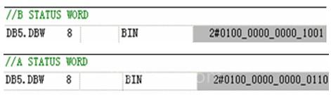 Ø A-B B-A的DB必须同时使用,不能只有一个方向的(A-B 0 BYTE ,B-A 100BYTE -----B STOP;B-A 0 BYTE ,A-B 100BYTE -----A STOP)。否则,CPU停机,诊断缓冲区如图9: