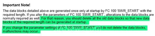 回答:FC100“SWR_START”在CPU启动会生成相关的DB块,修改参数后必须删除已生成旧的DB块,否则会导致CPU故障。手册描述如图14: