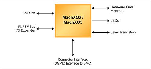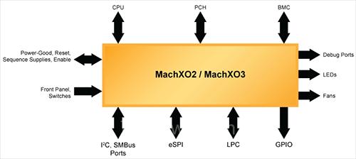 在图2中,MachXO2/3器件用于实现控制PLD功能,如电源/复位时序、各种类型的串行总线(I2C、SPI、eSPI、SGPIO等)、调试端口、LED驱动器、风扇PWM驱动器、前板开关传感以及其他一般GPIO功能。MachXO2/3器件支持1V信号,可实现带外信号功能集成,无需外部GTL收发器。当芯片运行时,设计工程师可使用莱迪思软件包中的Reveal工具调试控制PLD电路。该工具在PC上运行,可用作监视和捕获各种状态的逻辑分析器以追溯故障事件。例如,使用Reveal调试工具,设计工程师能够捕获许多导致故障状态的事件信息(包括寄存器、节点和引脚状态),并将其显示在PC显示器上。这可以显著减少系统电路板的调试用时。