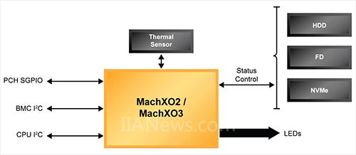 机架式服务器支持热插拔HDD/FD/NVMe驱动器。这些磁盘驱动器插入到背板。背板通过串行接口(如SGPIO和I2C)连接到主板。设计工程师可以使用MachXO2/3器件集成如图4所示的逻辑功能以实现背板控制。举个例子,当NVMe驱动器插入驱动器插槽时,MachXO2/3器件中的逻辑自动将状态和控制信号发送到I2C总线而不是SGPIO总线。