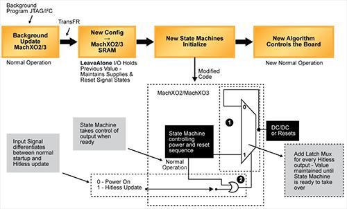 为了实现零停机更新,MachXO2/MachXO3器件通过“后台更新”将新的配置数据加载到配置闪存中。一旦加载完毕,“TransFR”指令将新的PLD镜像文件从配置闪存传输到PLD的配置SRAM。执行“TransFR”指令的同时触发了“保持当前状态”功能,确保所有的I/O值在传输过程中保持不变。最后,在“逻辑初始化”步骤,状态机将开始重新启动电源管理并复位电源分配。这将导致电源关断,迫使电路板开始电源上电过程。
