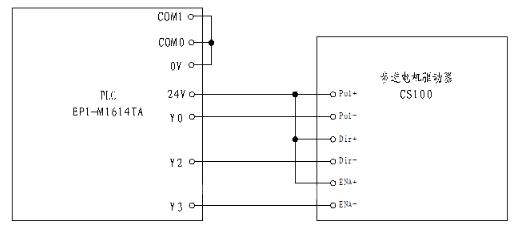 ② EP1系列的高速脉冲输出口为Y0和Y1。PLC控制步进电机时,可选择脉冲加方向控制方式,最多可以控制两轴(两台步进)。控制回路接线示意图: