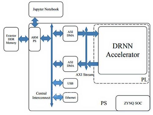 论文的大部分讨论了NLP和LM(语言模型),“它涉及机器翻译,语音搜索,语音标记和语音识别”。本文随后讨论了使用Vivado HLS开发工具和Verilog语言实现DRNN LM硬件加速器,可以为PYNQ开发环境合成一个定制的硬件覆盖。由此产生的加速器包含五个过程元素(PE),能够在此应用程序中提供20GOPS的数据吞吐量。以下是设计的框图: