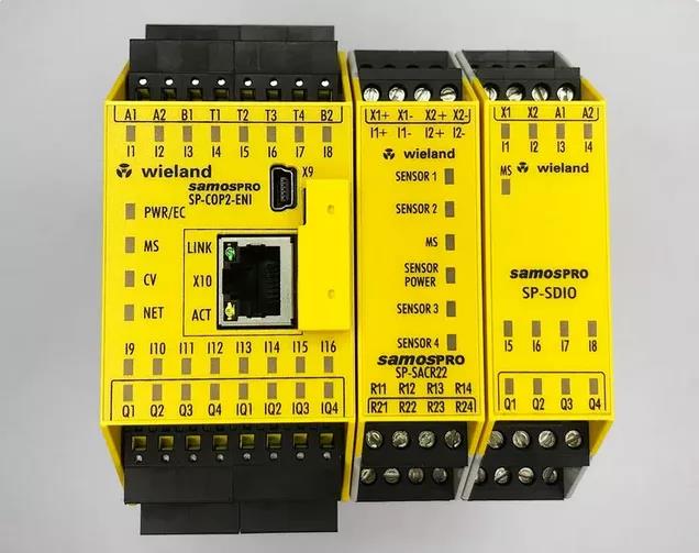 其次,在主控制器的正面有一个MiniUSB接口、一个RJ45网口和一个SD卡插槽,网口和MiniUSB都可以用来连接电脑进行编程。同时这个网口还可以使用ProfiNet、EtherNet/IP、Modbus/TCP等三种网络总线协议。在正面和PLC最大的区别是,这个安全控制器的三个模块正面上都有很多状态指示灯,标满了密密麻麻的端口号,在上下两侧各有2排端口,而PLC通常在CPU上不会有这么多端口。这是由于安全控制器的每个输入输出都有特殊的脉冲进行自我错误检测。下面我们来仔细看一下这些端口。