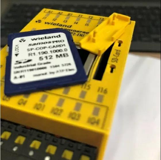 和现在多数PLC一样,这款安全控制器也有SD卡插槽,可以通过SD卡下载程序和存储数据。不过这里的SD卡插槽设计更加安全。SD卡加了盖子,小编烧了不少脑细胞才发现是怎么打开这个盖子的,盖子上有个锁止机构,用来固定SD卡,确保其不会掉出来,也不会被人轻易拿走。控制器的左侧除了扩展通讯用的连接器插槽之外,还有几个定位孔,以确保连接后不会晃动。