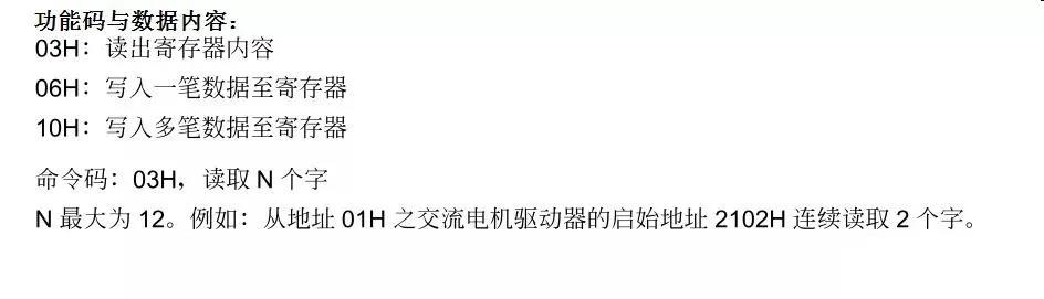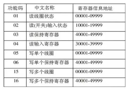 功能码指定了对从站设备读操作还是写操作,同时也指定了MODBUS寄存器地址的类型,常用功能码有: