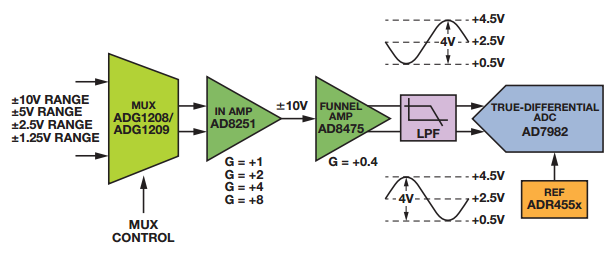 工业设计人员可以使用分立式高性能组件,为PLC或类似数据采集系统构建模拟模块,如下图所示。主要设计考虑因素包括输入信号配置、整体系统速度、精度和精确性。此处所示的信号链采用ADG1208/ADG1209低泄漏多路复用器、 AD8251快速建立可编程增益仪表放大器(PGIA)、AD8475高速漏斗放大器、AD7982差分输入18位 PulSAR®ADC和 ADR4550超低噪声基准电压源。这种解决方案提供四个不同增益范围,但在±10 V的最大输入信号的情况下,设计人员必然会担心多路复用器的切换和建立时间,以及其他模拟信号调理问题。此外,在1 MSPS速率下实现真正的16位性能可能是一个严峻挑战,即便在使用这些高性能器件时也是如此。