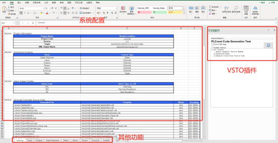 在模板的Excel工作簿中,最右侧是Visual Studio开发的VSTO插件,包含,刷新、生成表格、和生成工程源文件的选项。Settings工作表中的内容是工程配置文件,可以指定名称、目标控制器的sdk设置。