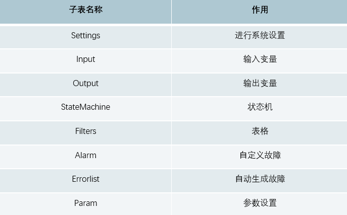 在Input、Output、Param表中,指定变量的名称、类型、初始值和范围,在实际过程中如果超过范围限制会触发报警。