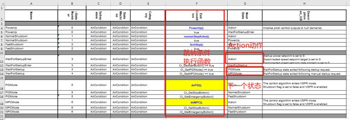 在StateMachine表中,可以定义状态名称和切换条件,对于每个状态,如果”Next State”中标记为Action,那么Exit Condition列中的函数为该状态要执行的操作,而如果”Next State”中标记为另外一个状态,Exit Condition列中的表达式为从当前状态切换到下一状态的条件。