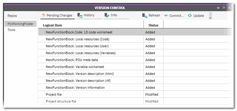 VCS是版本控制系统(Version Control System)的缩写,是一种记录文件内容变化,以便将来查阅特定版本修订情况的系统。在PLCnext Engineer中,VCS可以用于存档文件/文档并捕获对它们所做的每个修改。在这种情况下,这些文件是包含所有基本数据(代码、变量、HMI、版本信息、设备参数等)的PLCnext Engineer解决方案。将解决方案添加到存储仓库后,可以使用管理软件来控制PLCnext Engineer中的程序块版本,可以将更新版本发送(提交)到此仓库中,如函数块FB,函数FC,数据块DB,软件单元。使用“远程仓库”可以很方便与团队成员交换程序块等。目前用的比较多的如svn,Git等。