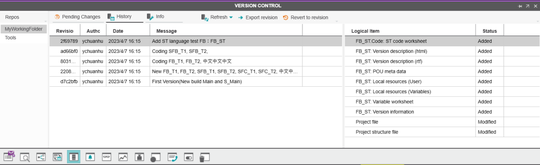 在PLCnext Engineer中,版本管理功能被放在交叉功能区的版本控制窗口内,通过以下步骤可实现PLCnext Engineer程序的版本管理功能:
