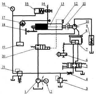 1 —液压泵;2 —电动机;3 —溢流阀;4 —节流阀; 5 —换向阀;6 —蜗轮蜗杆;7 —液压缸;8 —滑台; 9 —调速阀;10 —液压马达;11 —联轴器;12 —行程开关; 13 —刺辊;14 —针布齿条;15 —小液压缸;16 —压力表; 17 —定滑轮;18 —手轮;19 —重锤; 20 —电磁换向阀;21 —减压阀。