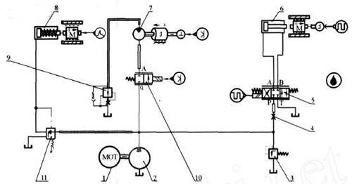 1 —电动机;2 —液压泵;3 —溢流阀;4 —节流阀;5 ,10 —换向阀;6 ,8 —液压缸;7 —液压马达;9 —调速阀;11 —减压阀。
