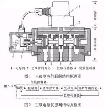 三级电液伺服阀是为了满足大流量要求而出现的一种先导式电液伺服阀, 其结构原理如图1所示, 结构方框图如图2所示。它由一个小流量的双喷嘴挡板式力反馈式二级伺服阀(先导阀)、功率滑阀、位移传感器和伺服控制器组合而成。功率滑阀由先导阀驱动,通过位移传感器检测功率滑阀阀芯位移并反馈到伺服控制器构成位置闭环, 以实现阀芯位移与输入信号成比例变化, 因输出流量与阀芯位移成比例, 从而使得三级电液伺服阀的输出流量与输入信号成比例关系。