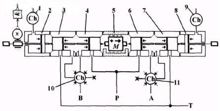 功率滑阀模型选用AMESim 软件液压元件设计库、液压库和机械库中的模块来建立, 如图4 所示。在功率滑阀模型中, 用模块5来考虑阀芯的质量、阀芯的粘性阻尼、阀芯所受库仑摩擦力和限制阀芯的行程; 用模块3、4、6、7、10和11来考虑阀芯所受的液动力、阀芯和阀套的径向间隙以及节流棱边的重叠量; 用模块1、2、8和9来考虑阀芯两端控制面积和控制腔的容积。